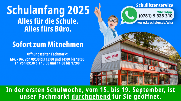 In der ersten Schulwoche vom 15. bis 19. September ist unser Fachmarkt durchgehend für Sie geöffnet.